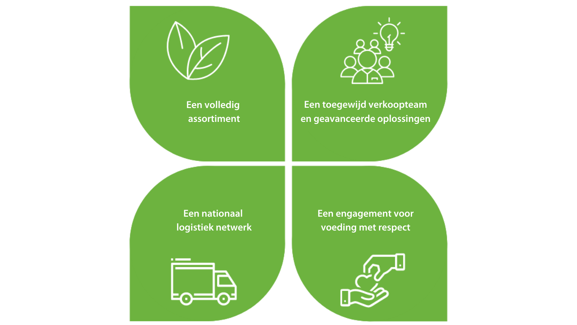 | Een volledig assortiment van verse, diepgevroren en ongekoelde producten van hoge kwaliteit. | | Een toegewijd verkoopteam en geavanceerde oplossingen voor veiligheid, duurzaamheid en bevoorrading. | |